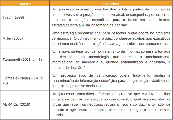 Com base no que aponta a literatura visitada neste artigo, existe um processo sistemático (planejar, coletar, analisar e disseminar informações), legal e ético, que tem como um dos seus resultados um produto, para apoiar a tomada de decisão e, ao mesmo tempo, direcionar as estratégias e as operações de uma organização (KAHANER, 1998; TARAPANOFF, 2006).