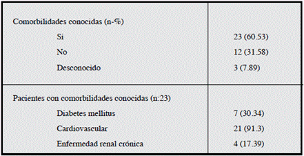 El tiempo transcurrido desde el inicio de los síntomas hasta el diagnóstico fue en promedio 90 días (rango inter-cuartílico entre 28 y 457 días). El 60.53% de los pacientes presentaban alguna comorbilidad, encontrando patologías cardiovasculares en más del 90% de los pacientes (Tabla 2).