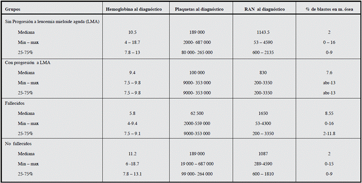 Existió una progresión a leucemia mieloide aguda en 7.69%, mientras que la mortalidad fue 15.38%. Todos los pacientes que progresaron a leucemia mieloide aguda fallecieron, y dos de las tres muertes adicionales se relacionaron con procesos infecciosos. La mortalidad y la progresión a leucemia se presentó en los pacientes que fueron clasificados como alto riesgo según la WPSS y los del grupo de riesgo intermedio y alto riesgo según el IPSS-R. Mientras que dichos desenlaces se presentaron en los pacientes con alto riesgo, intermedio-2 e intermedio -1 según MDACC e IPSS. Los pacientes fallecidos y con progresión a leucemia tenían un recuento de plaquetas y de niveles de hemoglobina menores que los que no presentaron estas complicaciones, lo contrario se observó en el porcentaje de blastos en médula ósea al diagnóstico (Tabla 5).