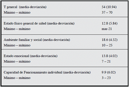 La calidad de vida fue medida a través de la escala Functional Assessment Cancer Therapy (FACT-G), la cual es una escala de autoaplicación que evalúa cuatro aspectos diferentes incluyendo la situación de salud física general (siete ítems), ambiente familiar y social (siete ítems), estado emocional (seis ítems) y capacidad de funcionamiento personal (siete ítems). Cada ítem se puntúa en una escala tipo Likert de cinco niveles que van desde cero (nada) hasta cuatro (muchísimo), con un puntaje que oscila entre 0 y 108 puntos. A mayor puntaje mayor calidad de vida, sin embargo no existe un punto de corte. Esta escala se encuentra validada en nuestro país a partir del estudio de Sánchez R, et al. 6.