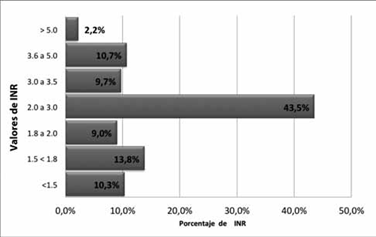De los 2232 registros de INR, INR mayor de 3.5 en 241 (10.7%) visitas, INR mayor de 5 en 50 (2.24%) visitas e INR menor de 1.5. en 244 (10.9%) visitas.