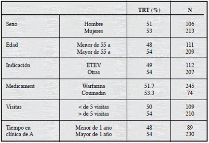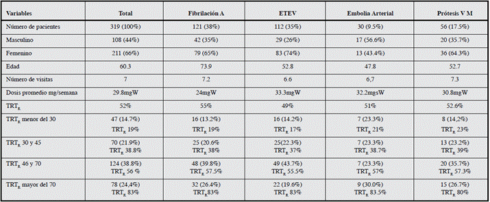 Métodos y resultados: estudio descriptivo de corte transversal entre el 1° de enero de 2011 y el 29 de febrero de 2012. Fueron evaluados 2232 resultados de INR de 319 pacientes. 98 550 días de seguimiento. 44% (108) hombres, 66% (211) mujeres, la edad promedio 60.3 años, siete visitas promedio/año, dosis semanal de warfarina 29.8 mg. La dosis semanal presenta una relación inversa con la edad, en menores de 45 años 37.9 mg y en mayores de 75 años 22.1 mg. El TRTR incrementó de 48 - 54%, respectivamente. Las indicaciones para anticoagulación: fibrilación auricular (FA) 38%(121), enfermedad tromboembólica venosa (ETEV) 35%(112), prótesis valvulares (PV) 17.5%(56) y embolia o trombosis arterial (EA) 9.5%(30). 228 pacientes (71%) presentaron un TRTR promedio del 64%. (40-100) INR mayor de 5 en 2.24% e INR menor de 1.5 en 10.9%. Sangrados menores: 16 pacientes (5%), sangrado mayor se presentó en dos pacientes (0.65%) y un evento adverso por embolia (0.32%). Los factores asociados a un TRTR bajo fueron: sexo masculino, enfermedad tromboembólica venosa, uso de warfarina genérica, edad menor de 55 años, tiempo menor de un año y menos de cinco visitas.