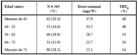 Dosis semanal promedio de warfarina 29.8 mg. Las dosis extremas menores de 21mg (16 mg/sem) se encontraron en 106 pacientes (33%) y dosis mayores de 49 mg (67 mg/sem) en 25 pacientes (7.8%); 188 pacientes (59.2%) tenían dosis promedio (31.4 mg/sem). La dosis semanal de warfarina presentó una relación inversa con la edad, en menores de 45 años la dosis semanal de warfarina fue 37.9 mg y disminuyó a 22.1 mg en mayores de 75 años (Tabla 2). El TRTR en pacientes menores de 55 años fue 48% y en pacientes mayores de 55 años fue 54%.
