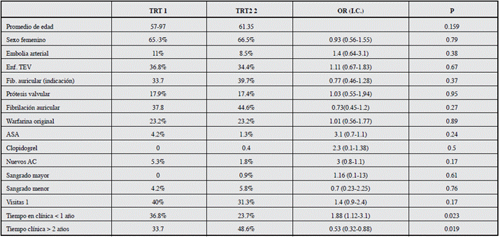 Los factores asociados a un TRTR bajo aunque no presentan significancia estadística fueron, sexo masculino, enfermedad tromboembólica venosa, uso de warfarina genérica, edad menor de 55 años. Factores asociados con un TRTR bajo y con significancia estadística fueron el tiempo menor de un año en la clínica de anticoagulación y menos de 5 visitas en el servicio. Las características de estos factores se presentan en las Tablas 3 y 4.