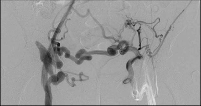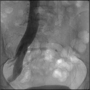 Debido a eventos repetitivos se considera en 2011 realización de angiotomografía abdominopélvica la cual reportó obstrucción de la vena ilíaca izquierda, várices pélvicas con circulación colateral hipogástrica, se realizó nuevo perfil autoinmune con ANAS presentando nuevamente títulos bajos y patrón moteado, ENAS negativos, debido a estos hallazgos se realizó flebografía más iliocavografía (Figuras 1 y 2) documentándose obstrucción de la vena ilíaca externa izquierda y la común denominado síndrome de Cockett, anormalidad anatómica la cual desencadenó estos eventos por lo cual se propone manejo endovascular con stent, en la actualidad perfil autoinmune negativo.