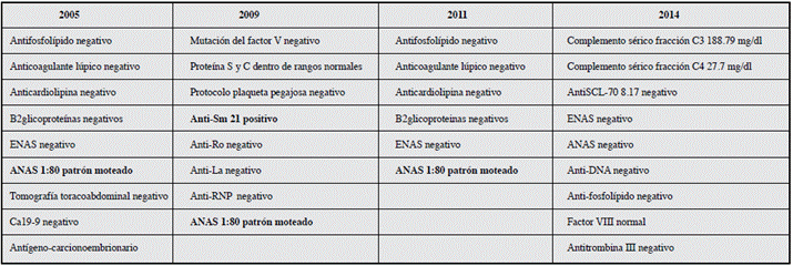 Sin ningún otro hallazgos al examen físico, sin antecedente de cáncer ni cirugías previas en ninguno de los eventos, por lo cual se decidió realizar estudios de extensión para neoplasia (Tabla 1) descartándose la misma, estudios negativos para trombofilia, dentro del perfil inmunológico de 2005 se evidenció ANAS positivos 1:80 patrón moteado los cuales persisten positivos en el tiempo, en 2011 anti-Sm positivo; sin embargo, al no cumplir ningún criterio de patología reumatológica se realizó el diagnóstico de enfermedad del tejido conectivo no diferenciado y se inició manejo con anticoagulación plena.