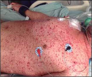 Paciente con evolución tórpida, a las seis horas de ingreso a cuidado intensivo, presenta disminución de cifras tensionales en rango de choque, que no responde a los bolos de cristaloides, por lo cual se inicia vasopresor. Hay importante progresión mucocutánea de las lesiones vesiculares (Figura 1) y deterioro de los índices de oxigenación PO2/FIO2 150 (presión de oxígeno sobre la fracción inspirada de oxígeno).