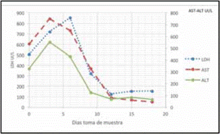 Al séptimo día de ingreso paciente presenta leve mejoría de los índices de oxigenación, no obstante con respuesta inflamatoria sistémica, se inicia manejo antibiótico empírico con piperacilina/tazobactam y linezolid, con ajuste a colistin y meropenem, en vista de aislamiento de Pseudomona aeruginosa multirresistente en cultivos de secreción orotraqueal, encasillando un nuevo diagnóstico; neumonía asociada a la ventilación mecánica posible. Al décimo día paciente con mejoría clínica, disminución de los requerimientos de vasopresor, mejoría de la oxigenación PO2/ FIO2 205, normalización de tiempos de coagulación, conteo plaquetario, azoados y transaminasas. Al día 18 paciente sin requerimiento de vasopresor, notable mejora de los índices de oxigenación, quien toleró prueba de ventilación espontánea y se decide extubar. A los cuatro días sin criterios de respuesta inflamatoria sistémica por lo cual se da egreso.