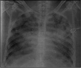 Se realiza intubación orotraqueal y apoyo ventilatorio. Por otra parte presenta elevación de azoados en rango prerrenal con leve disminución del gasto urinario, con sedimento urinario normal. A las 48 horas de ingreso presenta estigmas de sangrado digestivo asociado prolongación de tiempos de coagulación, trombocitopenia, disminución de fibrinógeno y elevación de los productos de degradación, en el contexto de CID, requiere transfusión de hemoderivados (Figuras 2-4). Radiografía de tórax muestra opacidades parenquimatosas sin broncograma a nivel del lóbulo superior derecho y se considera neumonía por varicela. A las 24 horas presenta mayor deterioro de la oxigenación (PO2/FIO2 90) con opacidades parenquimatosas en cuatro cuadrantes, en el contexto de SDRA severo por Berlín (Figuras 5 y 6), se inicia metilprednisolona en infusión, y se realiza ventilación mecánica en APRV (ventilación con liberación de presión en la vía aérea) con respuesta parcial por lo que se considera protocolo de pronación, con importante recuperación de los índices. Ecocardiograma transtorácico reporta fracción de eyección de 55% con signos sugestivos de hipertensión pulmonar, presión sistólica de la arteria pulmonar de 48 mmHg (milímetros de mercurio).