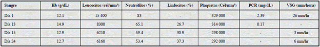 Exámenes de laboratorio con leucocitosis leve y neutro-filia, discreta elevación de proteína C reactiva (PCR) y velocidad de sedimentación globular (VSG), sin compromiso en función renal o pruebas de coagulación. ELISA para VIH y tuberculina negativos (Tabla 1).