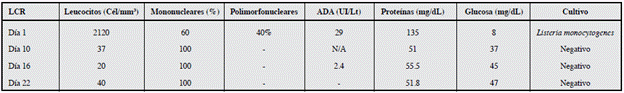 La neuroinfección por Listeria monocytogenes, que incluye meningitis y rombencefalitis, se ha descrito tradicionalmente en personas en los extremos de la vida (menores de un año, mayores de 50 años), embarazadas y pacientes inmunosuprimidos con disfunción de la inmunidad celular. Es poco frecuente el compromiso de pacientes jóvenes sin estas condiciones predisponentes. La elevación de la adenosin-deaminasa (ADA) en líquido cefalorraquídeo (LCR) se ha descrito como una prueba con alta sensibilidad y especificidad para el diagnóstico de meningitis tuberculosa, pero no en la causada por Listeria monocytogenes.
