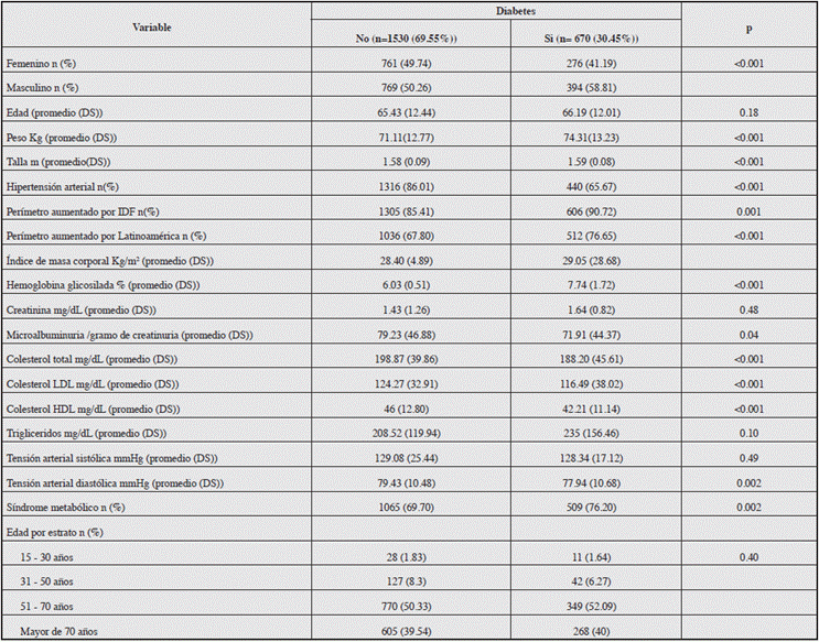 Se reclutaron 2200 pacientes, de los cuales 30.45 % (670 pacientes) tienen diabetes tipo 2. En la población diabética se encontró: edad promedio de 66.19+12,01 años, con una proporción de mujeres de 41.19%; 65.67% hipertensos; 90.72% perímetro de cintura aumentado por criterios de IDF, 76.65% perímetro de cintura aumentado por criterios latinoamericano, hemoglobina glicosilada 7.74+1.72 %; el promedio de colesterol total 188.20+45.61 mg/dL; colesterol HDL 42.21+11.14 mg/dL; colesterol LDL 116.49+38.02 mg/dL; triglicéridos 235+156.46 mg/dL y 76.20% tienen síndrome metabólico.