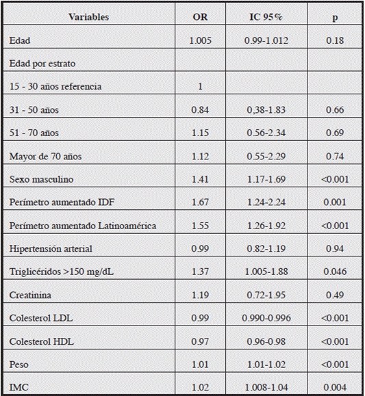Se realizó análisis univariado encontrando que los factores que se relacionaron con la presencia de diabetes fueron: el sexo masculino OR = 1.41 (IC95% 1.17-1.69, p<0.001); triglicéridos > 150 mg/dL, OR= 1.37 (IC 95% 1.005-1.88, p=0.046); peso OR=1.01 (IC95% 1.01-1.02, p <0.001); índice de masa corporal OR =1.02 (IC95% 1.008 - 1.04, p<0.001); perímetro de cintura aumentado por criterios de IDF OR =1.67 (IC95% 1.24-2.24, p<0.001) y perímetro de cintura aumentado por criterios latinoamericanos OR = 1.55 (IC95% 1.26 - 1.92, p<0,001).