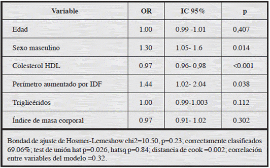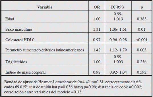 En el análisis multivariado se incluyeron las variables relevantes encontradas en el univariado, se realizó un modelo con perímetro de cintura aumentado por criterios de IDF (Tabla 3) (Modelo 1) y el modelo 2 con perímetro de cintura por criterios latinoamericanos (Tabla 4) (Modelo 2).