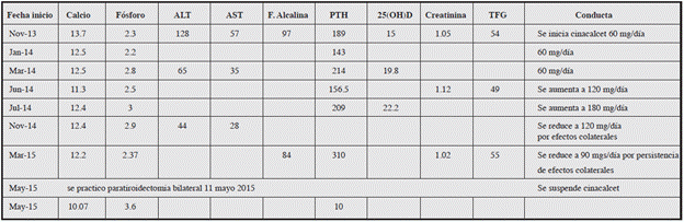 En pacientes no candidatos a cirugía, o mientras se compensan para la misma se ha propuesto la utilización de cinacalcet (para el control de la hipercalcemia), un medicamento que actúa sobre el receptor allosterico del calcio en las glándulas paratiroides aumentado su sensibilidad. La dosis recomendada en HPTP inicial es de 30 mg dos veces al día, escalando hasta una dosis de 90 mg tres o cuatro veces al día 22, pero en la práctica clínica es común la generación de efectos colaterales como los descritos por la paciente, cuando la dosis supera los 90 mg. En nuestro caso a pesar de la utilización de dosis altas de cinacalcet no fue posible lograr cifras normales de calcio sérico, lo cual refleja el carácter autónomo de las adenomas paratiroideos, sobre todo cuando su volumen es superior a 500 mm3.