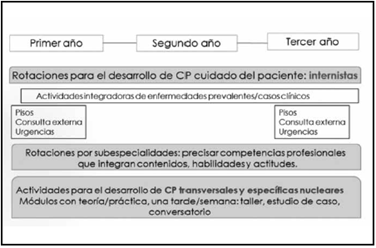 Además, se requiere pasar de un desarrollo empírico e intuitivo de CP de profesionalismo a uno de tipo explícito, planeado. En concordancia, con lo anterior también es necesario precisar los temas y los tiempos para desarrollar CP de gestión y administración; en otras palabras, se han de concertar: los temas eje de la medicina interna y CP transversales, reconocer las patologías prevalentes del adulto, identificar los temas fundamentales de las subespecialidades, planear las asignaturas y las actividades con docentes internistas durante toda la especialidad para los MR (Figura 2).
