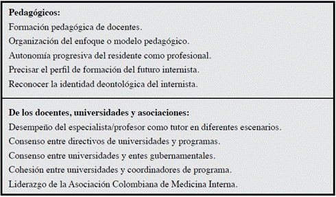 Administrativas y de gestión: optimizar los recursos del Sistema de Salud para visibilizar la práctica del internista como un especialista importante para el Sistema General de Seguridad Social en Salud (SGSSS); saber la normatividad que rige el SGSSS; y saber sobre la seguridad y la calidad de atención al paciente.