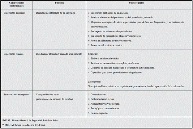 En el perfil propuesto se agrupan todas las CP de la literatura, pero enriquecidas con nuevas CP emergentes. De acuerdo con el concepto renovado de competencia en educación y CP con una mirada socioconstructivista se reestructuran las categorías que aparecen en la literatura, en particular, la categoría de "competencias de conocimiento médico"; lo anterior, porque el conocimiento es parte de todas las CP. El conocimiento médico, que tiene un internista, se organiza en: 1. Procesos de aprendizaje que son actualizar los conocimientos de forma permanente; saber aprender, desaprender y volver a aprender; contextualizar el conocimiento científico a cada paciente; identificar los límites entre el conocimiento en medicina interna y el de las subespecialidades para definir su acción; 2. Áreas de conocimiento específico que abarcan conceptos desde las ciencias básicas que se integran a las ciencias clínicas para brindar atención y cuidado a un paciente.