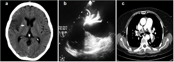 Mujer de 53 años con antecedente de discapacidad mental quien ingresa al servicio de urgencias por cuadro clínico de cuatro horas de evolución consistente en somnolencia, desviación de la comisura labial y disnea. Al examen físico taquicárdica, hipotensa y con desviación de la comisura labial a la izquierda. Se realiza tomografía axial computarizada de cráneo que muestra infarto de la arteria cerebral media derecha (PANEL A) y doppler venoso de miembros inferiores negativo para trombosis venosa profunda. Durante su hospitalización presenta acidosis metabólica, hipoxemia moderada y troponinas positivas en ascenso. Un ecocardiograma transesofágico revela un trombo en transición a través de cortocircuito interauricular (foramen oval) e hipertensión pulmonar severa (PANEL B). Una angiografía por tomografía computarizada de tórax evidencia un tromboembolismo masivo (PANEL C). Se considera un diagnóstico de embolismo paradójico y se inicia anticoagulación. Se realiza ecocardiograma control que no muestra trombo, por lo cual se realiza cierre percutáneo con dispositivo Amplatzer.