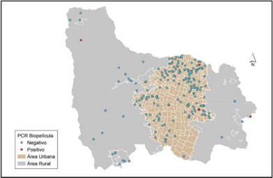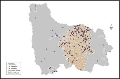 Las IEO en las que se presentaron positividad por la prueba de PCR estuvieron ubicadas en los barrios Popular, Manrique, Villa Hermosa, San Javier, Guayabal, Palmitas y Santa Elena. La ubicación espacial de las cuatro muestras positivas por PCR no mostró una relación con suministro de agua potable o diferente al acueducto municipal como aguas veredales (Figuras 1, 2).