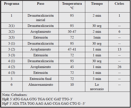 La extracción del ADN se realizó con el Wizard® Genomic DNA Purification Kit (Promega, Promega, Winsconsin, USA) siguiendo las instrucciones de la casa fabricante. Para la amplificación de los diferentes fragmentos de ADN del genoma de H. pylori, se aplicó una mezcla de reacción compuesta por: agua destilada (29.3 ul); Buffer 10X (5.0 ul); dNTPs (4.0 ul); MgCl2 (3.0 ul); ureA F (1.0 ul); ureA R (1.0 ul); Glicerol al 50% (5.0 ul); DMSO (1.0 ul); Taq polimerasa (0.2 ul); y ADN (5.0 ul). Se emplearon los cebadores descritos por Benson y col. especificos para el gen ureAHpR 5'ATG GAA GTG TGA GCC GAT TTG-3' y HpF 5'ATA TTA TGG AAG AAG CGA GAG CTG G-3') 25. Esta detección se realizó utilizando como control negativo agua grado reactivo para evitar falsos positivos, y como control positivo se usaron aguas contaminadas con la cepa de la ATCC de H. pylori (Tabla 1).