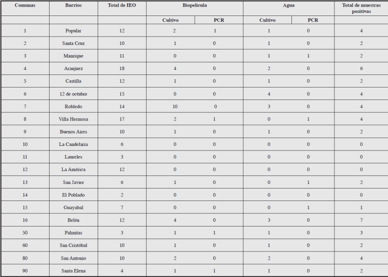 La positividad de las muestras de agua y biopelículas recolectadas en las diferentes IEO de la ciudad de Medellín se distribuyó según las comunas y se pudo observar que sólo en los barrios de La Candelaria, Laureles, La América y El Poblado no presentaron escuelas positivas para Hp por cultivo o PCR ni en agua ni en biopelícula. Las muestras de las escuelas del resto de comunas si fueron positivas por alguna de las pruebas (Tabla 2).