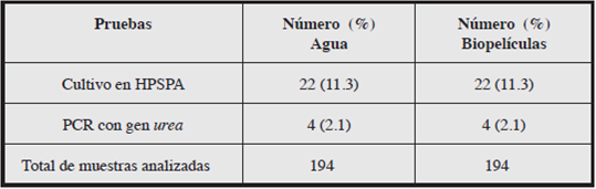 La detección de Hp en agua por medio del cultivo en agar HPSPA fue 11.3% (22), así mismo en las muestras de biopelículas cultivadas en el medio HPSPA fue 11.3% (22). La presencia de ADN de Hp en agua determinada por la prueba de PCR directa con la secuencia de oligonucleótidos del gen ureA fue de 2.1% como también en las muestras de biopelículas con 2.1%(44). Sólo una muestra de biopelículas presentó positividad por el cultivo y por PCR.