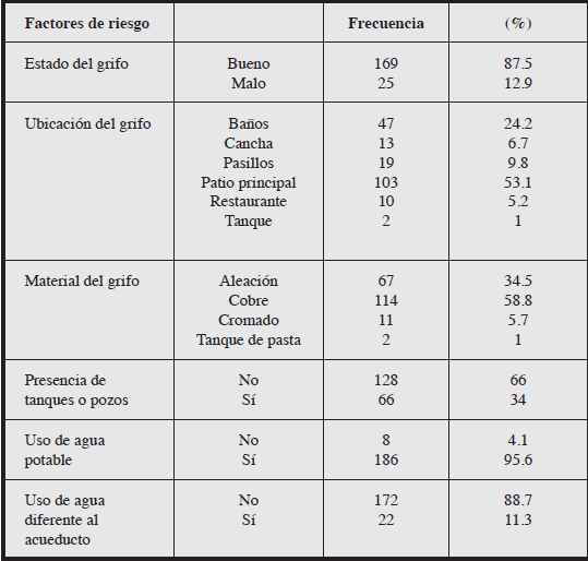 En cuanto a los factores de riesgo se encontró que la mayoría de las escuelas estaban reformadas hace poco tiempo, el estado de los grifos en 87.5% fue bueno; la ubicación del grifo fue en 53% en el patio principal; el cobre fue el material más frecuente en los grifos con 58.8%. En cuanto al suministro de agua, el 4.1% (8) de las escuelas no tenían agua potable, el 11.3% (22) de ellas utilizaban agua de acueductos veredales (Tabla 4) y sólo 34% (66) tenían pozos. Al analizar los años de la edificación de cada institución se observó un promedio de 39.1 + 20 años de antigüedad.