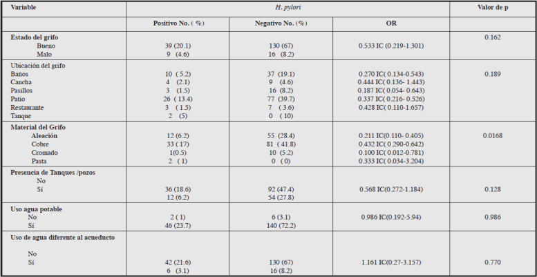En el análisis bivariado, al evaluar la asociación entre la presencia de Hp (teniendo en cuenta que la muestra de agua o biopelícula fueron positivas por cualquiera de las dos técnicas) y variables como: estado del grifo, la ubicación del grifo, material del cual estaba hecho el grifo, uso de pozos, agua potable, aguas no potables, anos de edificación, no se encontró asociación estadísticamente significativa (p>0.05) entre estas variables (Tabla 5).