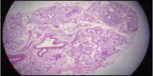 Por presencia de xerostomía y xeroftalmia asociado a ENA (anticuerpos nucleares extractables) positivos se realizó biopsia de glándula salival menor que documentó sialoadenitis crónica severa (Figura 1).
