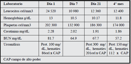Una segunda revisión de la biopsia renal reportó glomerulonefritis de patrón membranoproliferativo con presencia dominante de proliferación extracapilar 33%, inmunofluorescencia IgG, IgM y C3, C1q negativo.