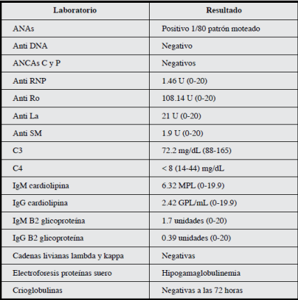 En la literatura se ha descrito la disminución de C3, hipergamaglobulinemia en especial IgG (70.8%) y aumento de ß2 microglobulina 5,7. Son factores de predicción del compromiso glomerular niveles bajos de C4 y crioglobulinemia 10.