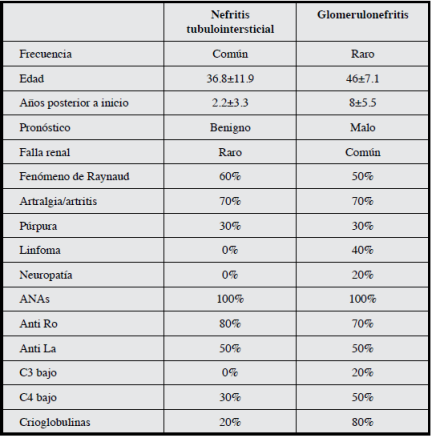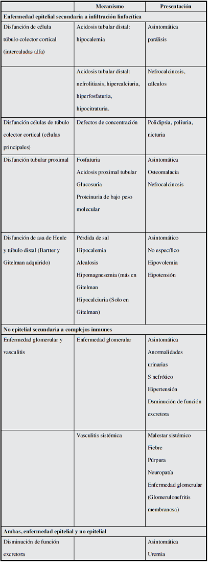 El compromiso renal en SSP se divide en glomerular o tubular 5. La nefritis tubulointersticial aguda o crónica y los defectos de concentración son muy frecuentes 3. En el SS secundario el compromiso renal puede ser similar a otras enfermedades autoinmunes 1.