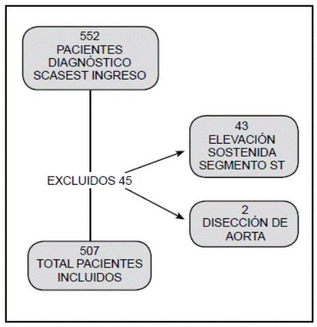 Pacientes con diagnóstico de síndrome coronario agudo sin elevación del segmento ST, mayores de 18 años, ingresados en forma consecutiva a la unidad de cuidados coronarios de una institución de alta complejidad, en el periodo comprendido entre enero de 2013 y noviembre de 2014.