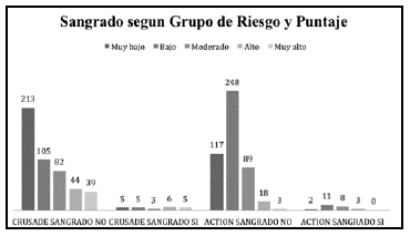 Cuando comparamos las tasas de sangrado por cada uno de los grupos de riesgo según la estratificación por CRUSADE, excepto para el grupo de alto riesgo, el porcentaje de sangrado es mucho menor; en pacientes de muy bajo riesgo la tasa de sangrado fue de 2.3% comparado con 3.1% del CRUSADE, 4.6% vs 5.5% en bajo riesgo, 3.6% vs 8.6% en riesgo moderado, 12% vs 11.9% en alto riesgo y del 11.4% vs 19.5% en el grupo de muy alto riesgo, respectivamente. Para el ACTION el porcentaje de tasa de sangrado también fue mucho menor en nuestra población según la clasificación de cada uno de los grupos de riesgo.