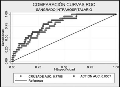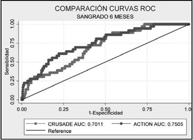 Results: in this analysis, the highest observed bleeding rate was 4.8%. The presence of major bleeding was associated with a higher probability of mortality during six-month follow-up (OR 5.316, 95% CI 1.77 -15.92, p = 0.002). The calibration of the risk scales was adequate according to the Hosmer-Lemeshow statistic (p> 0.05). Both scales showed good discrimination without statistically significant differences in the intrahospital setting (AUC ROC CRUSADE ACTION 0.77 vs 0.80 p = 0.19) one month (AUC ROC CRUSADE ACTION 0.70 vs 0.75 p = 0.08) and 6 months (AUC ROC CRUSADE ACTION 0.71 vs 0.76 p = 0.09), respectively.