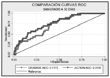Finalmente, para la comparación de la capacidad predictiva de las dos escalas, se llevó a cabo una prueba estadística que compara áreas bajo la curva AUC-ROC, con el algoritmo de DeLong, DeLong y Pearson. La comparación se realizó de forma intrahospitalaria, al mes y seis meses, con el desenlace de sangrado. Para estas pruebas se usó nivel de significación estadística de 0.05.