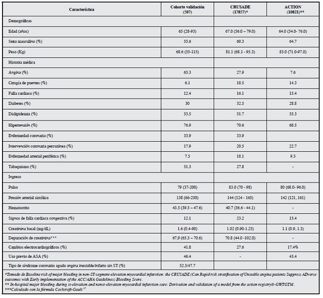 En el presente estudio, se ha evaluado la capacidad predictiva de dos escalas de riesgo de sangrado en pacientes con SCASEST, encontrando algunas diferencias en las características basales en la población estudiada con respecto a las reportadas en las escalas CRUSADE y ACTION. En la muestra el peso fue en promedio de 68.6 kg vs la población de CRUSADE y ACTION que fue de 81.1 kg y 83.0 kg, respectivamente; el 51.3% de nuestra población tenía antecedente de tabaquismo, porcentaje mayor al reportado en el CRUSADE, en el cual fue de tan sólo 27.8%, igualmente en el nivel sérico de creatinina encontrándose un valor promedio de 1.6 mg/dL comparado con 1.02 mg/dL y 1.1 mg/dL de las escalas respectivas, pero con tasas de depuración de creatinina calculadas similares entre los pacientes incluidos en los diferentes estudios. En las demás variables demográficas podemos observar factores y perfiles de riesgo similares a las escalas que hemos validado.