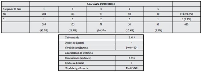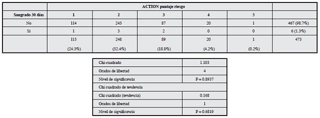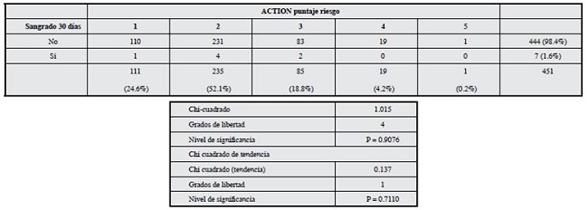 Al mes. Del desenlace de interés, se presentó sangrado en seis pacientes representando un 1.3%. La distribución de sangrado es similar en los diversos grupos de riesgo, sin diferencias significativas, para el CRUSADE (chi2 homogeneidad 3.483 y p=0.48, 4 gl; chi2 de tendencia 0.75 y p=0.38, 1 gl), pero si para el ACTION (chi2 homogeneidad 6.672 y p=0.15, 4 gl; chi2 de tendencia 5,342 y p=0.02, 1 gl) (Tablas 2 y 3).