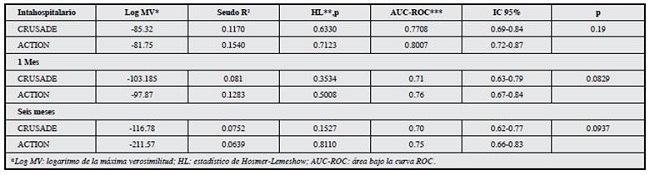 Para la validación de los modelos predictivos, se utilizaron las mismas estrategias que en el estudio original. Inicialmente se validaron los modelos de predicción clínica utilizados en los puntajes CRUSADE y ACTION en población de Medellín provenientes de una institución de alta complejidad. Para ello se utilizó el modelo de regresión binaria logística y las variables predictoras para CRUSADE intrahospitalario fueron: hematocrito, sexo, frecuencia cardiaca, presión arterial sistólica, signos y síntomas de falla cardiaca, presencia de diabetes mellitus, enfermedad arterial periférica como comorbilidad, y cálculo de la depuración de creatinina, mientras que para ACTION fueron: edad, sexo, peso, frecuencia cardiaca, presión arterial sistólica, hemoglobina, creatinina, signos y síntomas de falla cardiaca, cambios del segmento ST, diabetes mellitus y enfermedad arterial periférica como comorbilidad, sin considerarse el consumo de warfarina domiciliaria; así mismo para la validación al mes y a los seis meses se incluyeron estas mismas variables.
