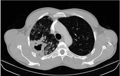 Posteriormente se obtuvo dos de tres baciloscopias positivas para bacilos ácido alcohol resistente en dos cruces (++ BAAR). La serología de anticuerpos para virus de inmunodeficiencia humana fue negativa. Se inició tratamiento antituberculoso estándar a base de tetraconjugado (rifampicina + isoniacida + pirazinamida + etambutol) ajustado al peso. Por progresión a hemoptisis no masiva, se realizó tomografía de tórax de alta resolución, documentándose múltiples densidades parcheadas, difusas comprometiendo ambos campos pulmonares, pero con mayor compromiso del pulmón derecho. También se anotó la presencia de cavitación en el lóbulo superior derecho, de 25 x 22 mm de diámetro con área de consolidación pericavitaria (Figura 1).