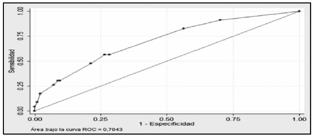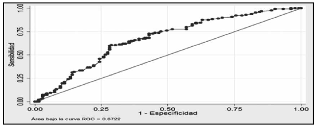 Se exploraron también dos modelos de predicción, el primero de predicción de bajos niveles de HbA1c (HbA1c<9%) con las variables edad >65 años y consumo de >4 dosis/día de medicamentos con OR en valores de protección, obteniéndose una AROC de 0.67. Y el segundo, de predicción de muerte intrahospitalaria, con las variables la HbA1c>9%, antecedente de ACV y de tabaquismo, con una AROC de 0.70 (Tablas 3, 4), (Figuras 1, 2).
