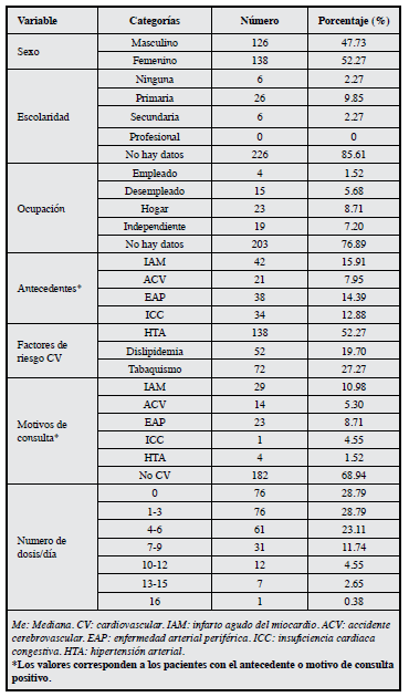 En el HUS fueron solicitados un total de 898 exámenes cuantitativos de HbA1c de enero a diciembre de 2013, se presentó una prevalencia de 3l.2%(n=281) de DM (HbA1c >6.5%). El promedio de HbA1c de los pacientes estudiados fue de 9.60% (DE 2.29%). El promedio de edad fue 60.4 ± 15 años, el 52.27% (n=138) eran mujeres, y la mayoría residía dentro del casco urbano. El 70.45%(n=186) recibían tratamiento para la DM y el 23.85%(n=63) no lo recibía. Dentro de los motivos de consulta de origen cardiovascular, el más prevalente fue el IAM l0.98% (n=29). El 68.93% (n=182) correspondió a un motivo de consulta de origen no cardiovascular. De la misma manera, el IAM representó el antecedente de evento cardiovascular más prevalente dentro de la serie (Tabla 1).