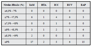 La prevalencia de eventos cardiovasculares en el grupo estudiado, según rangos de HbA1c definidos cada 0.5%, a partir de 6.5% se detalla en la Tabla 2.
