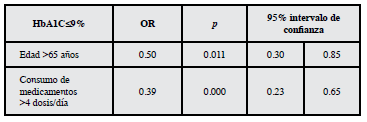 Al analizar el consumo de medicamentos (>4 dosis/día; <4 dosis/día) con la HbA1c dicotomizada (< 9; >9%) se encontró que más de 4 dosis/día se asociaba un 64% más con HbA1c < 9% (OR=0.36 IC95%:0.21-0.59; p=0.000). Adicionalmente, no se encontró asociación entre la variable consumo de medicamentos con antecedentes o motivos de consulta tipo cardiovascular.