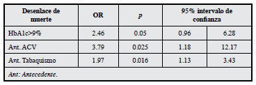 Después del análisis crudo bivariado, se estimaron posibles tendencias de asociación entre las variables independientes que dieron estimaciones con significancia estadística como el consumo de medicamentos, y las variables de desenlace HbA1c (< 9% y >9%) y desenlace de muerte.