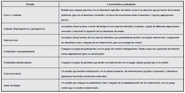 En la Tabla 1 se presentan los diseños epidemiológicos no aleatorizados más frecuentemente utilizados. La principal diferencia entre los ECA y los ENA es precisamente la falta de aleatorización de los segundos. Cuando se hace aleatorización (idealmente con un adecuado cegamiento), se reduce la posibilidad de que haya diferencias sistemáticas entre los grupos de intervención y de control, dado que el azar tiende a distribuir equitativamente tanto las características conocidas como las desconocidas de los pacientes y, aún en el caso de que no haya distribución simétrica, las diferencias se deben justamente al azar y no son producto de un sesgo.
