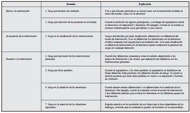 Adicionalmente, la herramienta ROBINS-I 16 permite evaluar otras potenciales fuentes de sesgo, similares a aquellas que se encuentran en los ECA, como: la clasificación de las intervenciones o exposiciones, el tratamiento diferencial, la evaluación diferencial de los resultados, el manejo de los datos perdidos y el reporte selectivo. En la Tabla 2 se presentan los dominios para la evaluación de sesgos de la herramienta ROBINS-I y una corta explicación de cómo éstos pueden afectar los ENA.
