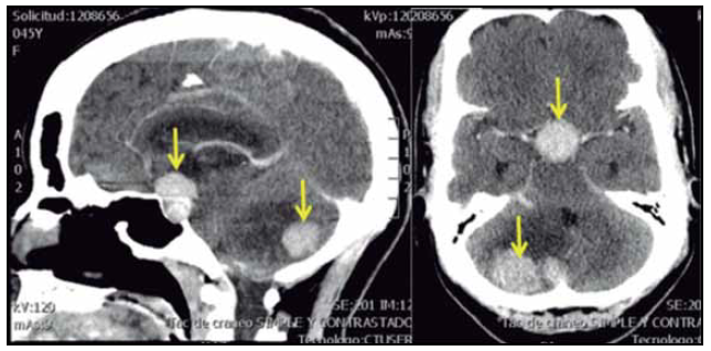 Al examen físico se encontró alerta, orientada en tiempo, espacio y persona, estable hemodinamicamente, afebril, álgica, con mucosas secas, sin asimetría facial, sensibilidad en cara conservada, movimientos de la lengua conservados, anisocoria, defecto pupilar aferente bilateral, ojo izquierdo solo percibía la luz, ojo derecho alcanzaba a contar dedos a 30 cm, sin oculoparesias, examen oftalmológico normal incluyendo el disco óptico, fuerza segmentaria conservada, sin paresias, reflejos osteotendinosos con hiperreflexia en miembro inferior izquierdo y normalidad en miembro superior ipsilateral, resto de reflejos normales, respuesta plantar neutra bilateral. Se abordó el cuadro como una cefalea crónica con banderas rojas siendo necesaria una tomografía axial computarizada (TAC) de cráneo simple, en donde se encontraron tres lesiones redondeadas, bien delimitadas, una de localización frontal derecha de menos de 1 cm de diámetro con edema vasogénico perilesional, otra localizada en el lóbulo parietal ipsilateral con características similares a la lesión frontal y una lesión selar de 15 mm de longitud siendo necesario caracterizar mejor las lesiones con estudio contrastado (Figura 1), el cual mostró múltiples lesiones parenquimatosas cerebrales, hipervascularizadas que captaban intensamente el contraste, con edema vasogénico en lóbulos frontal y parietal derechos, región hipofisiaria y cerebelosa derecha compatibles con metástasis. Algunas lesiones con extensión supraselar que desplazaba el quiasma óptico hacia superior. Se decidió iniciar manejo profiláctico anticonvulsivante con fenitoína sódica 100 mg cada 8 horas y manejo del edema cerebral con dexametasona 4 mg intravenosa cada 8 horas previa desparasitación.
