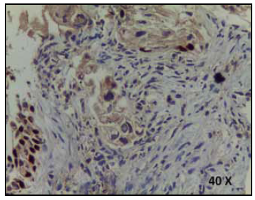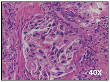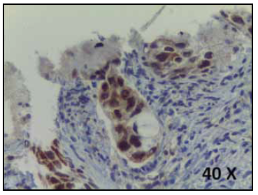 Ante los hallazgos identificados en las imágenes previas, se hicieron estudios de extensión para identificar foco neoplásico primario, la TAC contrastada de abdomen no mostró lesiones sugestivas de primario y la TAC contrastada de tórax (Figura 2) evidenció una masa pulmonar espiculada sin cavitación en el lóbulo superior derecho, adenopatías de localización hiliar derecha de 15 mm de diámetro en el eje corto y paratraqueales derechas de 13 mm de diámetro en el eje corto, sin lesiones líticas o blásticas en las estructuras óseas. La lesión pulmonar era sugestiva de carcinoma broncogénico siendo necesaria su confirmación histológica por biopsia mediante fibrobroncoscopia. Los hallazgos de la biopsia confirmaron el diagnóstico de un carcinoma de célula no pequeña compatible morfológicamente con un adenocarcinoma broncogénico (Figura 3), los marcadores de inmunohistoquímica fueron positivo para TTF1 (Figura 4) y negativo para P63 (Figura 5).